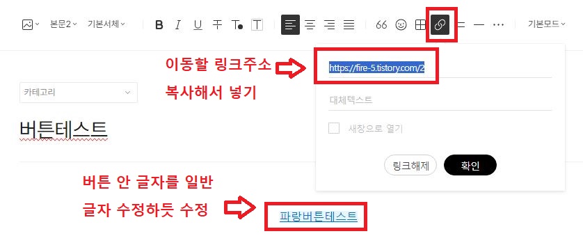 기본모드에서 버튼 서식을 불러온 후 생성된 글자를 일반적인 그 수정하듯이 수정한 후, 상단의 링크 연결 메뉴를 이용하여 이미지나 텍스트에 링크를 넣듯이 동일한 방법으로 이동할 주소로 링크를 걸어주면 됩니다.