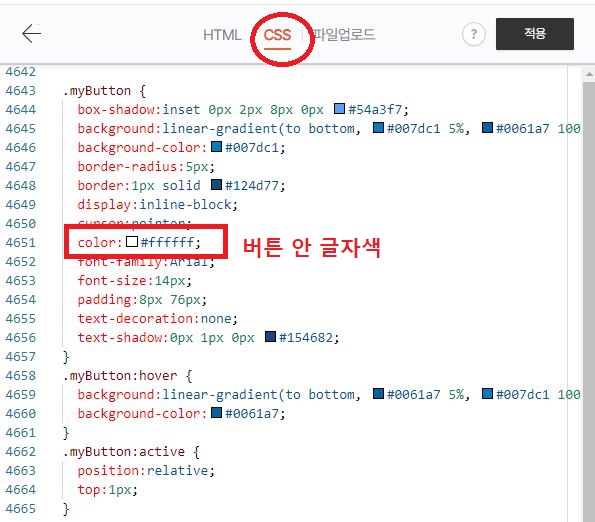 버튼 안 글자색이 원하는대로 나오지 않으면 color를 수정 마지막 f와 ; 사이에 "!important"를 넣어줍니다. |