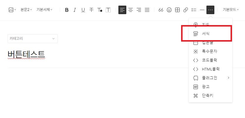 기본 모드로 글을 쓰다가 버튼을 넣을 곳에서 서식쓰기에서 이미 작성해 둔 버튼을 불러옵니다.