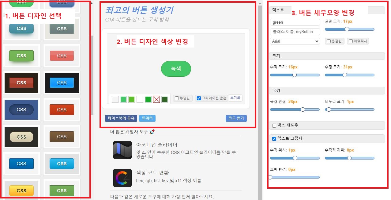 버튼 디자인 선택과 조정이 끝난 후에는 중간 라인에 있는 코드생성 버튼을 클릭하시면 오른쪽 칸에 버튼 디자인 세부선택란에 버튼의 코드가 생성됩니다.
