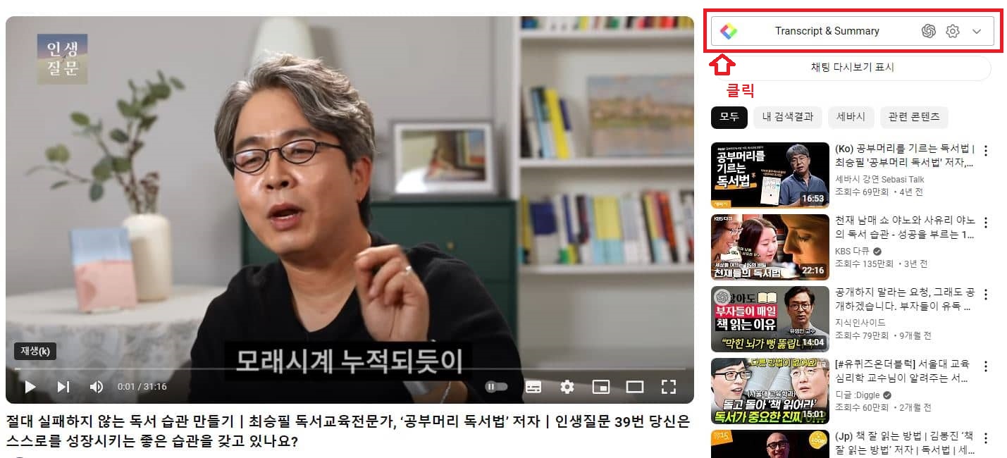 유튜브 영상을 시청하면서 오른쪽 상단의 "Transcript & Summary"를 클릭하시면 오른쪽 아래로 스크립트가 추출되는 것을 확인할 수 있습니다.