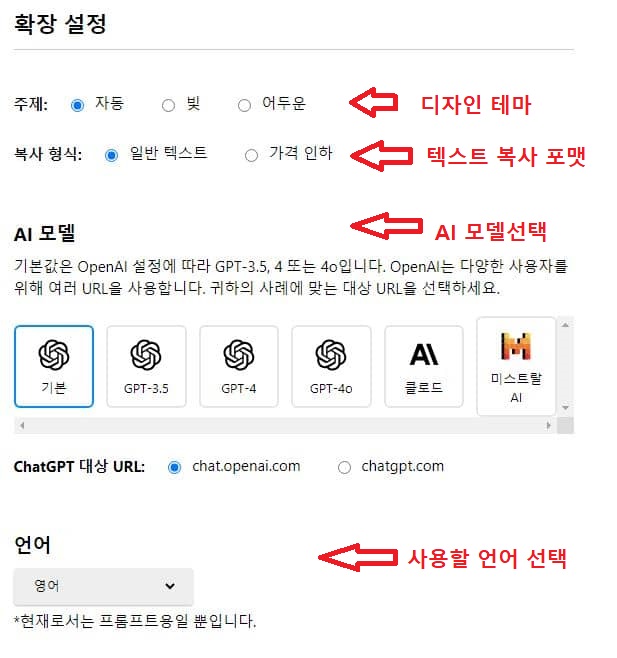 1. 디자인 테마 : 화면을 밝은 모드로 할지 어두운 모드로 할지 선택합니다. 2. 복사 형식 : 일반텍스트(Plain Text)는 텍스트만 복사가 되고, 가격인사(Markdown)은 해당 유튜브 링크와 텍스트가 함께 복사됩니다. 3. Ai 모델 선택 : 사용하고자 하는 Ai 모델을 선택하면 됩니다. 4. 언어 : 추출할 언어를 선택하면 됩니다. |