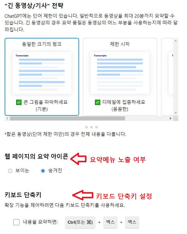 5. 요약메뉴 노출 여부 : 유튜브 화면에 요약 아이콘을 표시할 것인지 선택합니다. 6. 키보드 단축키 설정 : "Ctrl + X + X" 단축키를 누르면 새창이 뜨고 유튜브 영상 자막을 ChatGpt와 연결하여 바로 요약해 줍니다. 해당 기능을 사용하시려면 앞 체크박스에 체크하시면 됩니다. |