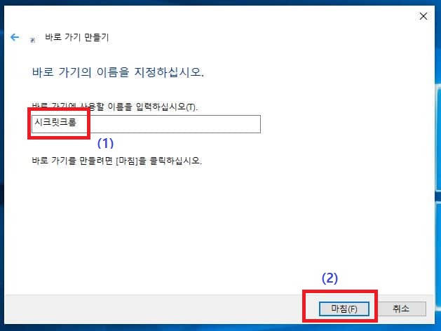 (1) 시크릿모드 크롬 아이콘의 이름을 설정합니다. (2) 마침 단계로 넘어갑니다. |