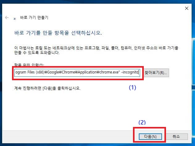 2. 크롬 시크릿 모드 주소와 아이콘 이름을 넣고 바로가기 생성