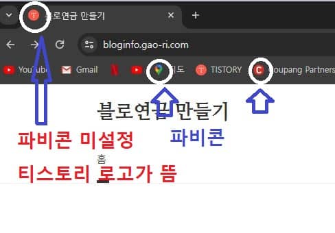 이렇게 티스토리의 파비콘이 나타나는 것 대신 자신의 블로그(홈페이지)의 이미지를 드러낼 수 있고 사용자들에게 자신의 블로그를 홍보할 수 있는 대표이미지를 파비콘으로 만들어서 노출시키면 보다 전문적이고 신뢰감 있는 블로그 운영을 하실 수 있습니다.