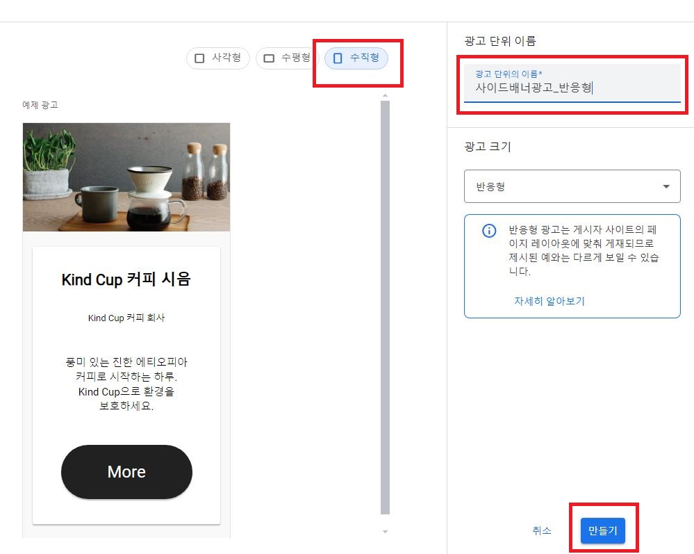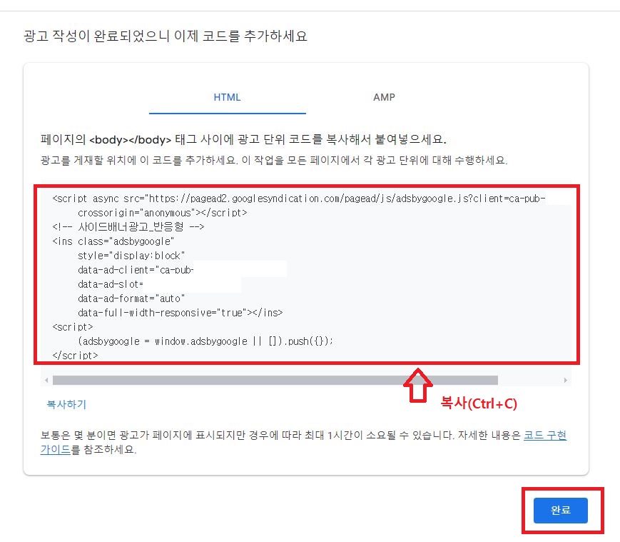 광고 모양 수직형 + 반응형으로 만들기 | 생성된 애드센스 광고 코드를 복사합니다. |