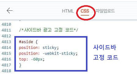 사이드 광고를 고정하는 아래 코드를 CSS 탭의 제일 아래쪽에 복사해서 붙입니다. 코드를 넣을 때 어떤 코드인지를 주석으로 처리해서 적어두시면 나중에 알아보시기 쉽습니다. 주석은 (/* 주석 */)의 형태로 넣으시면 됩니다.
