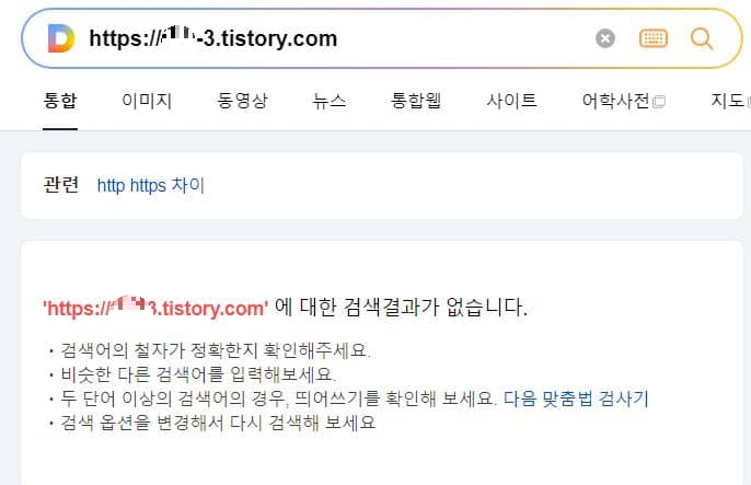 보통 티스토리가 저품질이면 이렇게 자신의 블로그 주소를 "Daum" 검색창에 넣었을때 검색결과가 없다는 메세지가 나옵니다.