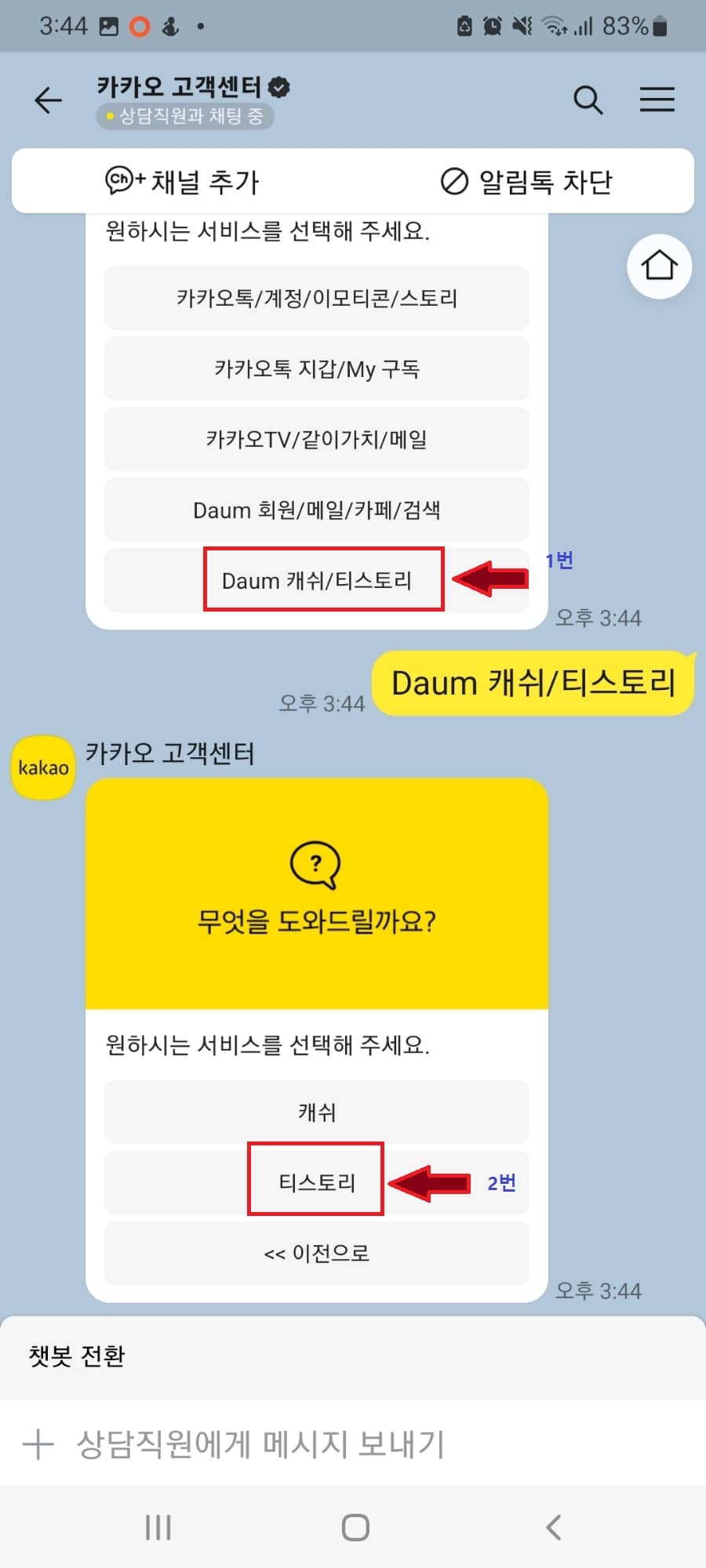 고객센터는 다음 홈페이지를 통해 문의하는 방법과 카카오톡을 이용한 문의가 있는데, 홈페이지를 통한 문의는 답변이 올 때까지 시간이 오래 걸릴 것 같아서 카카오톡 실시간 연결 방법을 사용했습니다.