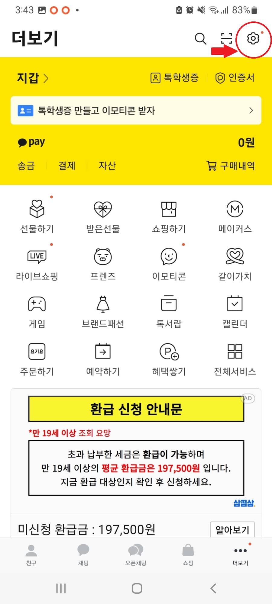 1. 카카오톡 열어 더보기 클릭 | 2. 위 오른쪽 상단 톱니 클릭 | 3. 아래쪽 고객센터/운영정책 | 4. 챗봇상담 들어가기 |