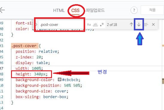 CSS 탭에서 Ctrl-F 키를 누른 후 ".post-cover"를 검색합니다. 검색 후 오른쪽의 아래 버튼을 눌러서 다음 코드와 동일한 코드를 찾으시면 됩니다. |