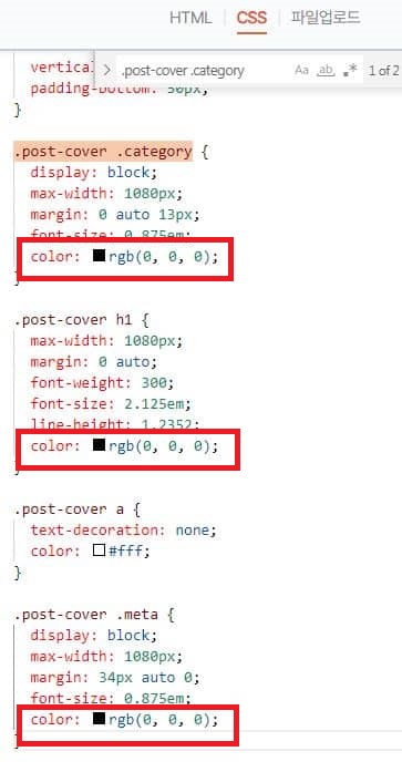| CSS 탭에서 ".post-cover .category"를 검색 | 각 부분의 색상을 검은색으로 변경 |