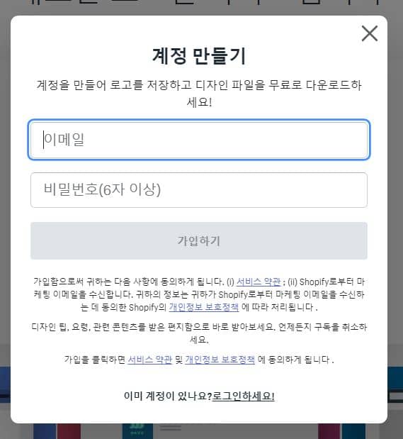 처음에 회원가입하지 않고 로고만들기를 클릭하셔서 사용하시면, 제일 끝 단계에서 파일을 다운로드 받기전에 이메일과 비밀번호 설정만으로 간단하게 계정만들기가 가능합니다.