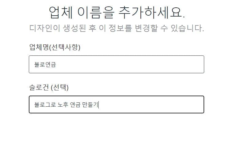 여기서 선택한 업체명은 로고 생성할 때 사용되니 일종의 간판이라고 생각하시면 됩니다. 그리고 로고 형태에 따라 슬로건도 같이 표시되기도 합니다.