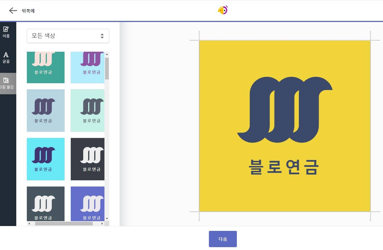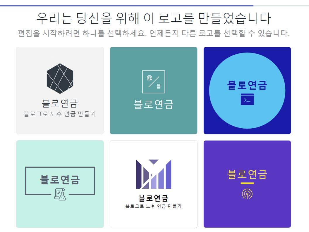 선택한 로고에 커서를 가져가시면 "로고편집"이라는 아이콘이 뜹니다. 이 아이콘을 클릭하시면 다음 단계로 로고의 폰트와 색상을 변경하여 선택할 수 있는 페이지로 넘어갑니다.