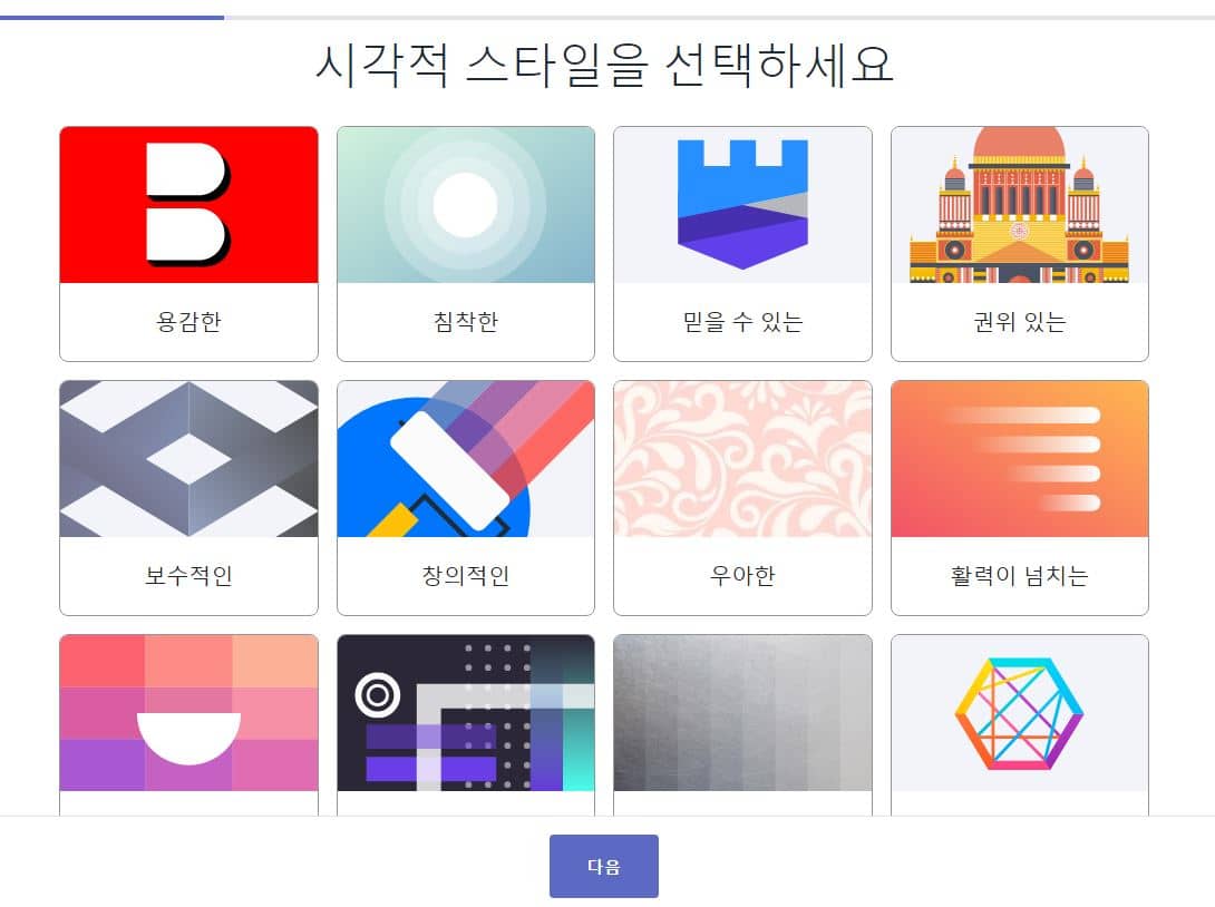 업체명과 슬로건을 이용하여 다양한 디자인의 로고들을 제시하고, 이중에 하나를 선택합니다. 선택된 로고의 폰트와 색상조합은 다음 단계에서 제한적이지만 변경하여 선택이 가능하니, 디자인만을 이 단계에서 고르시면 됩니다.